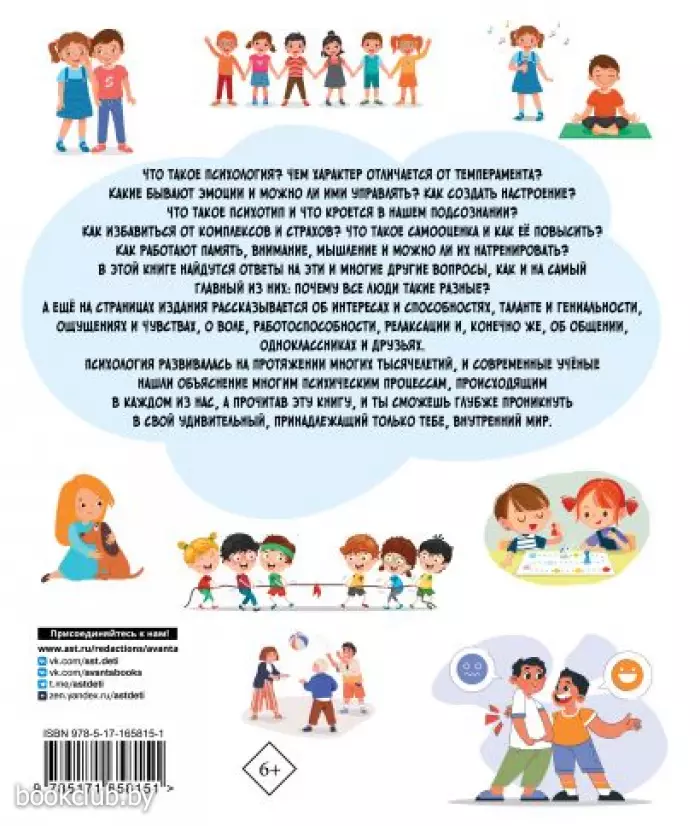 Дорогие родители, вы, конечно же, делаете всё, чтобы ваши дети росли здоровыми, умными, образованными. Настоящее издание — это увлекательное путешествие в мир психологии, которое поможет им разобраться в себе и своем окружении, подскажет, как повысить самооценку, развить волю, стать более уверенными в достижении поставленных целей и общении. На примере различных жизненных ситуаций и интересных историй юные читатели узнают, что такое темперамент и характер, чем способности отличаются от таланта и гениальности, разберутся во всевозможных психологических процессах, происходящих в каждом из нас, и в итоге поймут, почему же мы все такие разные. Помимо этого в книге содержится информация об эмоциях, чувствах и ощущениях, сознании и подсознании, описано, как работают память, внимание и мышление, рассказано о комплексах и страхах и, главное, о том, как их победить. А чтобы все эти знания лучше усвоились, на страницах издания приведено множество упражнений, заданий и тестов для самопроверки. И тем не менее эта книга — не скучный учебник, а ууникальный путеводитель по жизни, который поможет ребенку правильнее оценивать свои и чужие поступки, самые разные ситуации и свое место в этом мире.