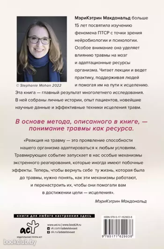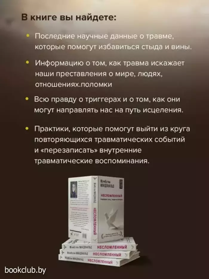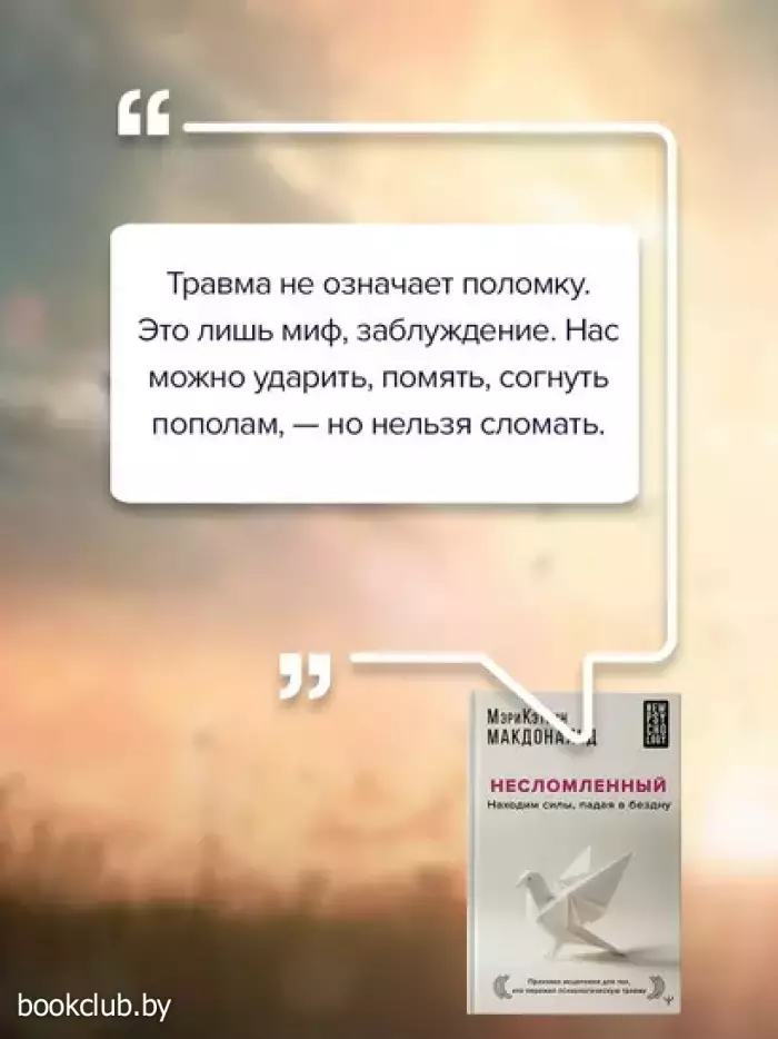 Существует заблуждение, что психологическая травма случается только с людьми, которые слишком хрупки или несовершенны, чтобы справляться с трудностями. Человек, переживший травму, часто испытывает стыд за то, что стал жертвой. Дипломированный психолог Мэри-Кэтрин Макдональд много лет исследовала этот феномен и доказала, что травмы помогают нам выживать и свидетельствуют о силе, "несломленности" и устойчивости нашей психики.