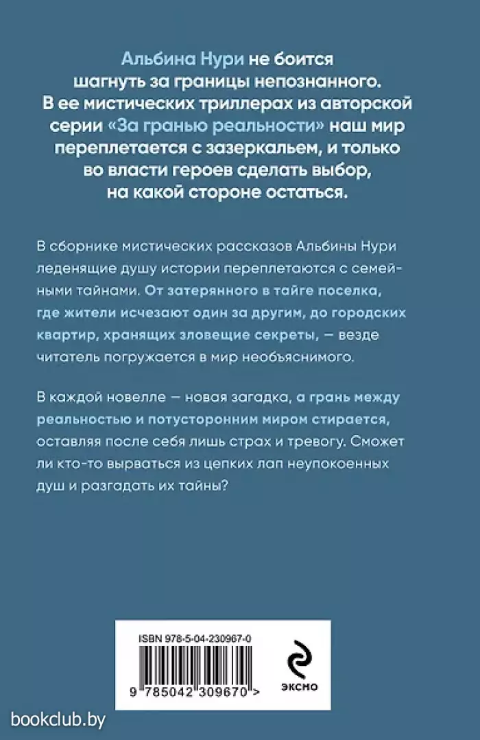 В сборнике мистических рассказов Альбины Нури леденящие душу истории переплетаются с семейными тайнами. От затерянного в тайге поселка, где жители исчезают один за другим, до городских квартир, хранящих зловещие секреты, — везде читатель погружается в мир необъяснимого. В каждой новелле — новая загадка, а грань между реальностью и потусторонним миром стирается, оставляя после себя лишь страх и тревогу. Сможет ли кто-то вырваться из цепких лап неупокоенных душ и разгадать их тайны?