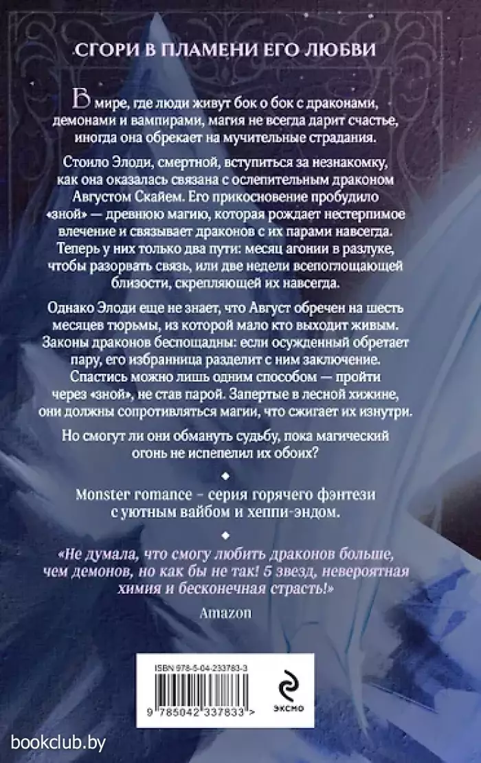 Monster romance — серия горячего фэнтези с уютным вайбом и хеппи-эндом про дерзкую и независимую героиню, укрощающую дракона. Фэнтези с тропами «вынужденная близость», «предназначенные судьбой», «запретная страсть». В мире, где люди живут бок о бок с драконами, демонами и вампирами, магия не всегда дарит счастье, иногда она обрекает на мучительные страдания. Стоило Элоди, смертной, вступиться за незнакомку, как она оказалась связана с ослепительным драконом Августом Скайем. Его прикосновение пробудило «зной» — древнюю магию, которая рождает нестерпимое влечение и связывает драконов с их парами навсегда. Теперь у них только два пути: месяц агонии в разлуке, чтобы разорвать связь, или две недели всепоглощающей близости, скрепляющей их навсегда. Однако Элоди еще не знает, что Август обречен на шесть месяцев тюрьмы, из которой мало кто выходит живым. Законы драконов беспощадны: если осужденный обретает пару, его избранница разделит с ним заключение. Спастись можно лишь одним способом — пройти через зной, не став парой. Запертые в лесной хижине, они должны сопротивляться магии, что сжигает их изнутри. Но смогут ли они обмануть судьбу, пока магический огонь не испепелил их обоих? Иллюстрация на обложке: Flyora Art. Художественное оформление Игоря Пинчука. Макет: Елены Ефименко. Книги издательства «ЭКСМО» из серии «Monster romance» - правильный выбор и отличное приобретение. Для вашего удобства при оформлении заказа по телефону назовите код товара: 417062