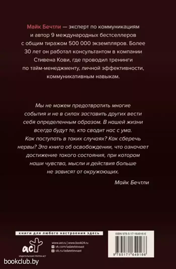 Как ни странно, другие люди не так сильно заинтересованы в нашем счастье, как нам того хотелось бы. Более того, иногда кажется, что они специально делают нашу жизнь невыносимой! В каждом коллективе всегда находится хотя бы один человек, кто постоянно выводит нас из себя. О, если бы мы могли просто «исправить» этого человека, все было бы идеально. Но изменить другого невозможно — так как же самому тогда перестать «заводиться»? В этой книге эксперт по коммуникациям Майк Бечтли научит, как перестать быть жертвой чужого безумия. Автор предлагает проверенную стратегию для сохранения здравомыслия в общении с трудными людьми. Сложные люди будут всегда. Не теряйте времени — посмотрите на них новым взглядом — и это сделает вашу жизнь проще!