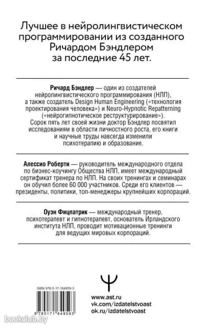 Книга «НЛП. Эффективно общайся, управляй эмоциями, избавляйся от страхов» - правильный выбор и отличное приобретение. Для вашего удобства при оформлении заказа по телефону назовите код товара: 404379