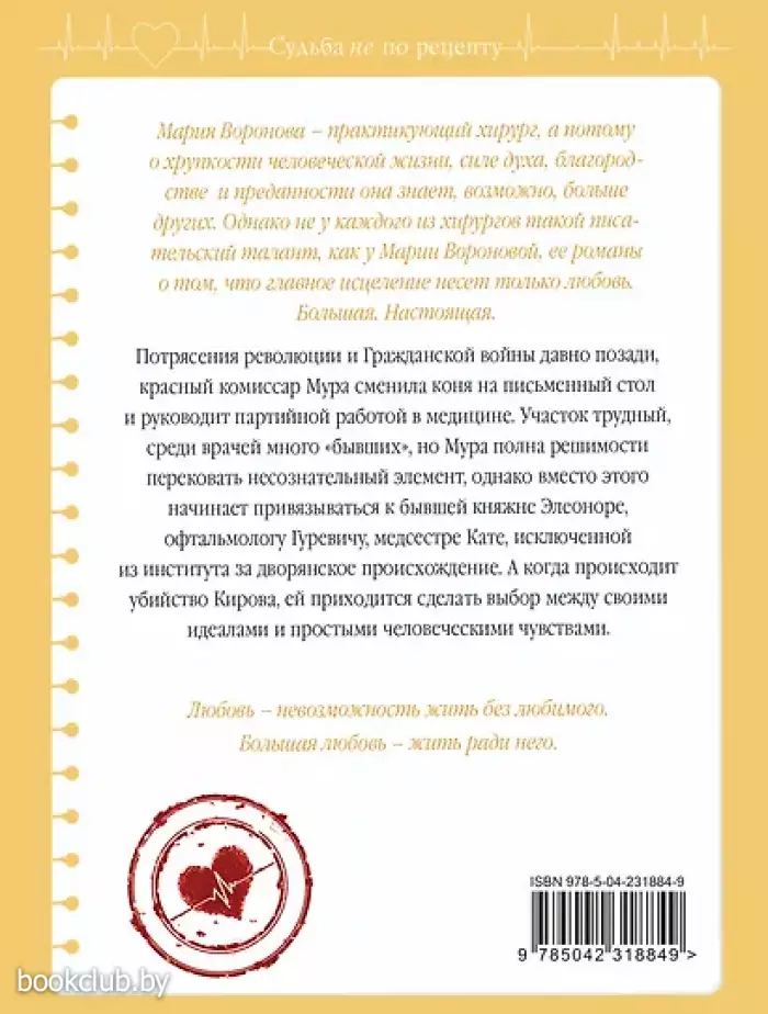 Потрясения революции и Гражданской войны давно позади, Красный комиссар Мура сменила коня на письменный стол и руководит партийной работой в медицине. Участок трудный, среди врачей много "бывших", но Мура полна решимости перековать несознательный элемент, однако вместо этого начинает привязываться к бывшей княжне Элеоноре, офтальмологу Гуревичу, медсестре Кате, исключенной из института за дворянское происхождение. А когда происходит убийство Кирова, ей приходится сделать выбор между своими идеалами и простыми человеческими чувствами? Книга от издательства «ЭКСМО», входящая в серию «Судьба не по рецепту. Романы М. Вороновой», принесет массу положительных впечатлений от прочтения и займет достойное место в вашей библиотеке. Для вашего удобства при оформлении заказа по телефону назовите код товара: 417064