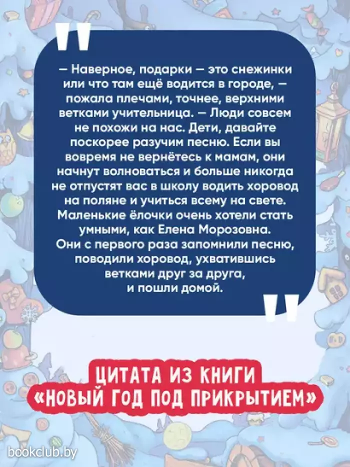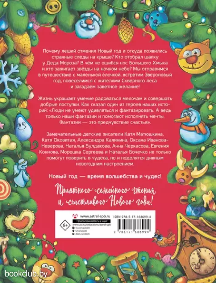 Почему леший отменил Новый год и откуда появились странные следы на крыше? Кто отобрал шапку у Деда Мороза? В чём не ошибся нос Большого Хмыка и кто зажигает звёзды на ночном небе? Мы отправимся в путешествие с маленькой ёлочкой, встретим Звероновый год, повеселимся с жителями Скверного леса и загадаем заветное желание! Жизнь украшает умение радоваться мелочам и совершать добрые поступки. Как сказал один из героев наших историй: «Люди не умеют удивляться и фантазировать. А ведь только наши фантазии и помогают исполнять мечты. Фантазии — это предчувствие счастья». Замечательные детские писатели Катя Матюшкина, Катя Оковитая, Александра Калинина, Оксана Иванова-Неверова, Наталья Булдакова, Анна Черкасова, Евгения Коннова, Морошка Сергеева и Наталья Бочечко не только помогут поверить в чудеса, но и поделятся дивным новогодним настроением. Новый год — время волшебства и чудес! Приятного семейного чтения и счастливого Нового года!
