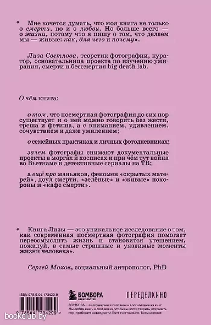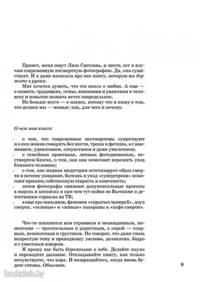 Меня зовут Лиза Светлова и шесть лет я изучаю современную посмертную фотографию. Да, она существует. И я даже написала про нее книгу, которую вы держите в руках. Мне хочется думать, что эта книга о любви. А еще – о памяти, традициях, семье, внимании и уважении к человеку и о попытке познать нечто запредельное. Но больше всего – о жизни, потому что я пишу о том, что делаем мы – живые: как, для чего и почему. Внутри вы найдёте исследования феномена посмертной фотографии и других практик: от викторианских портретов и обрядов до "живых" похорон и доул смерти. А ещё, что немаловажно, личные фотографии и рассказы людей, согласившихся поделиться своим опытом проживания смерти близких.