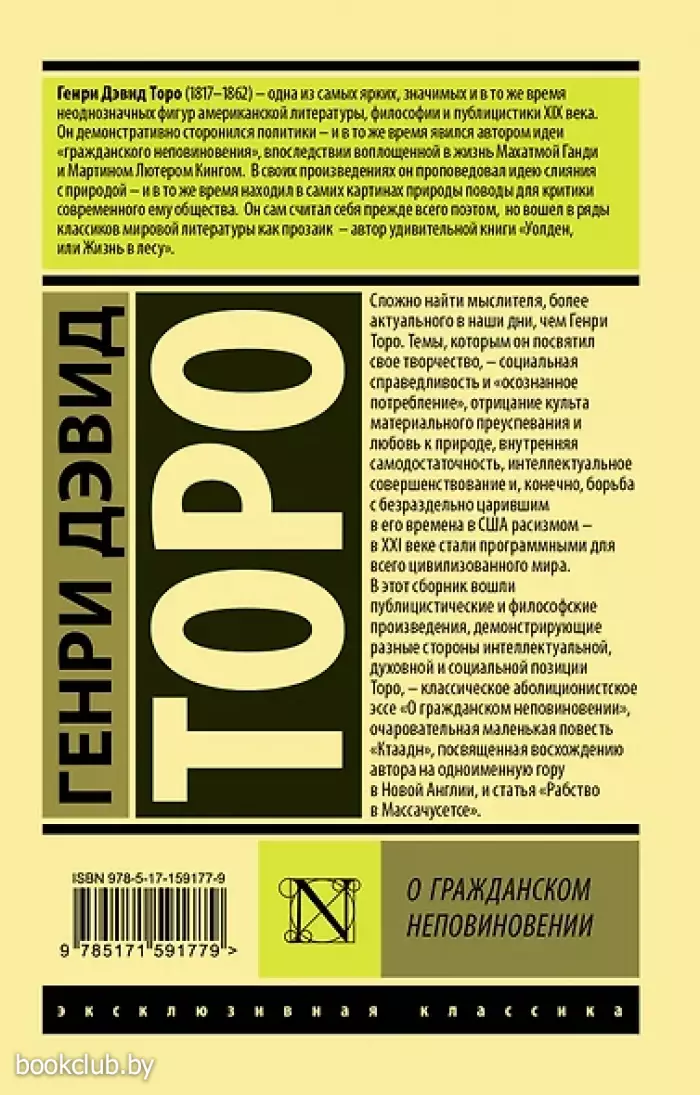 Сложно найти мыслителя, более актуального в наши дни, чем Генри Торо. Темы, которым он посвятил свое творчество, — социальная справедливость и "осознанное потребление", отрицание культа материального преуспевания и любовь к природе, внутренняя самодостаточность, интеллектуальное совершенствование и, конечно, борьба с безраздельно царившим в его времена в США расизмом — в XXI веке стали программными для всего цивилизованного мира.