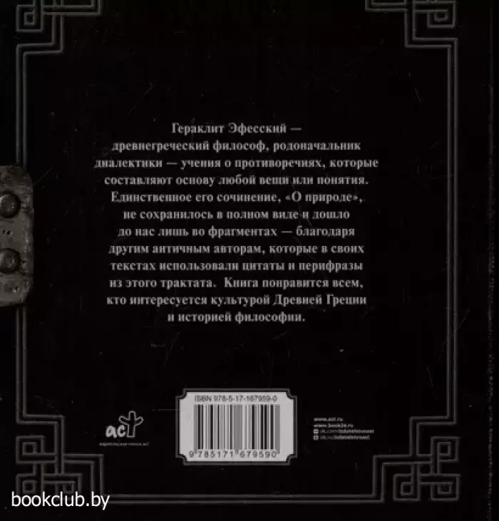 Гераклит Эфесский - древнегреческий философ, родоначальник диалектики - учения о противоречиях, которые составляют основу любой вещи или понятия. Единственное его сочинение, "О природе", не сохранилось в полном виде и дошло до нас лишь во фрагментах - благодаря другим античным авторам, которые в своих текстах использовали цитаты и перифразы из этого трактата. Далеко не всегда поддающиеся пониманию, исполненные таинственной мудрости высказывания Гераклита вызывали интерес философов и ученых на протяжении многих веков. В этой книге фрагменты "О природе" сопровождаются комментариями философа и доктора филологических наук Александра Маркова - он не только знакомит читателя со сложившейся традицией толкования Гераклита, но и размышляет над собственной трактовкой каждого фрагмента. Книга понравится всем, кто интересуется культурой Древней Греции и историей философии.