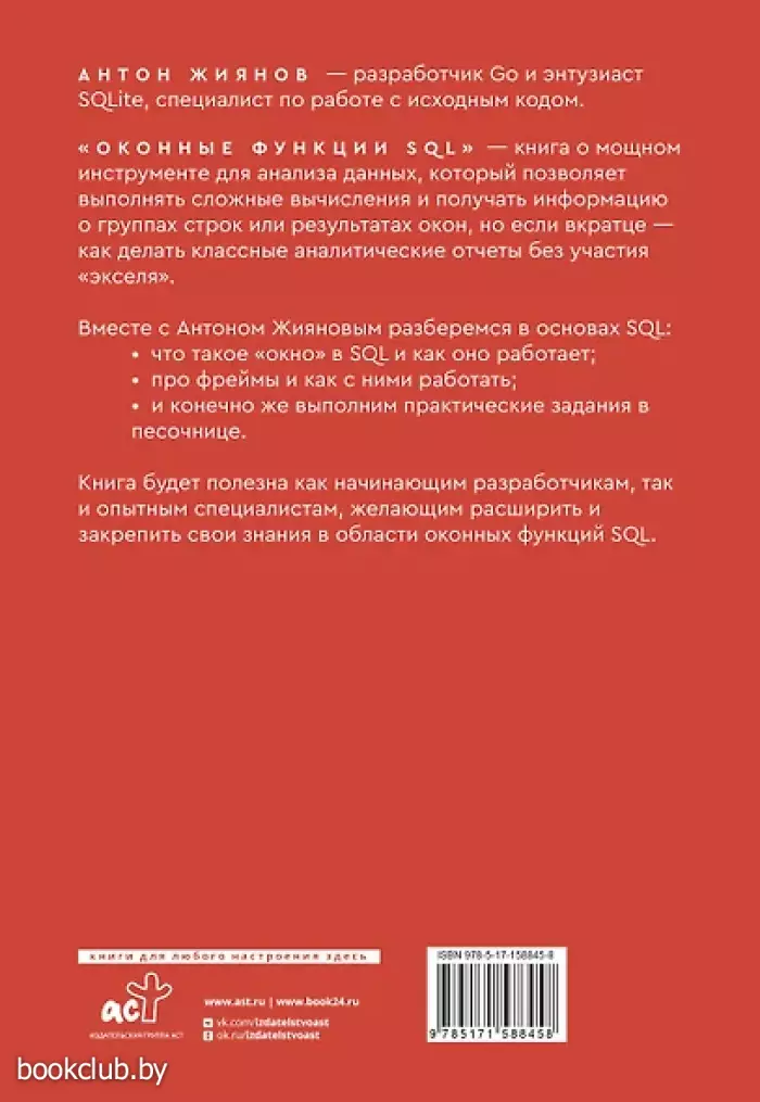 Антон Жиянов — разработчик Go и энтузиаст SQLite, специалист по работе с исходным кодом. "Оконные функции SQL" — книга о мощном инструменте для анализа данных, который позволяет выполнять сложные вычисления и получать информацию о группах строк или результатах окон, но если вкратце — как делать классные аналитические отчеты без участия "экселя". Вместе с Антоном Жияновым разберемся в основах SQL: • что такое "окно" в SQL и как оно работает; • про фреймы и как с ними работать; • и конечно же выполним практические задания в песочнице. Книга будет полезна как начинающим разработчикам, так и опытным специалистам, желающим расширить и закрепить свои знания в области оконных функций SQL.