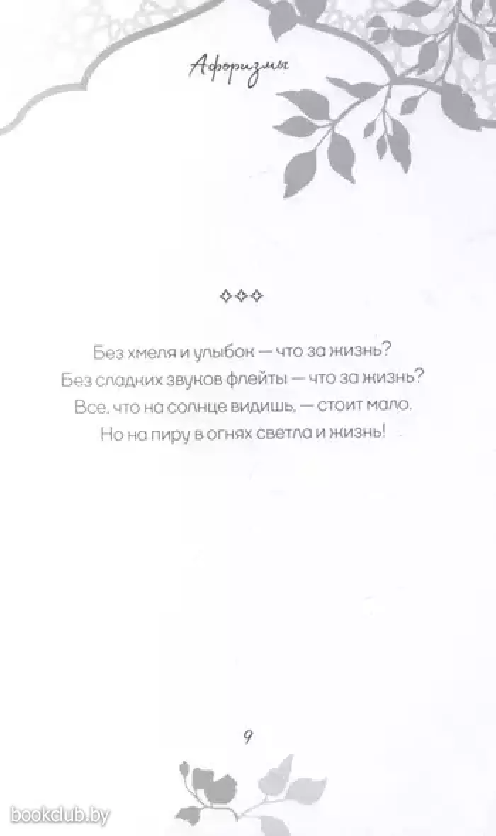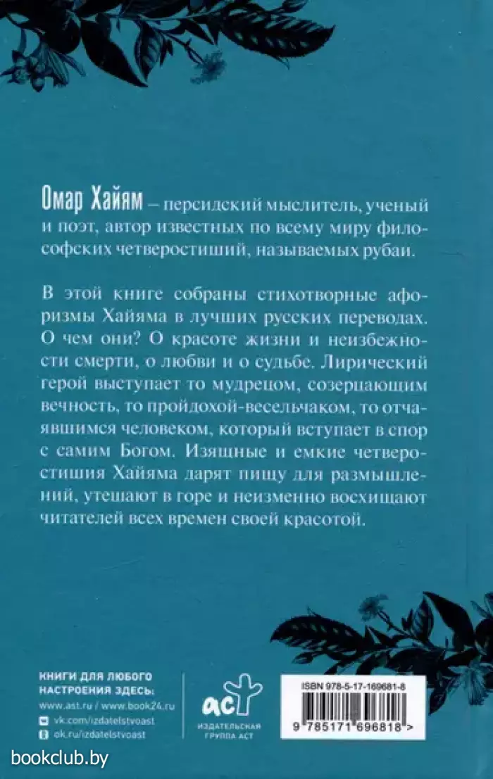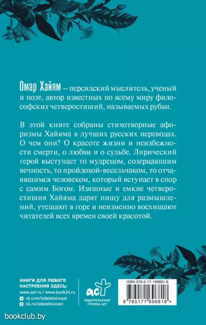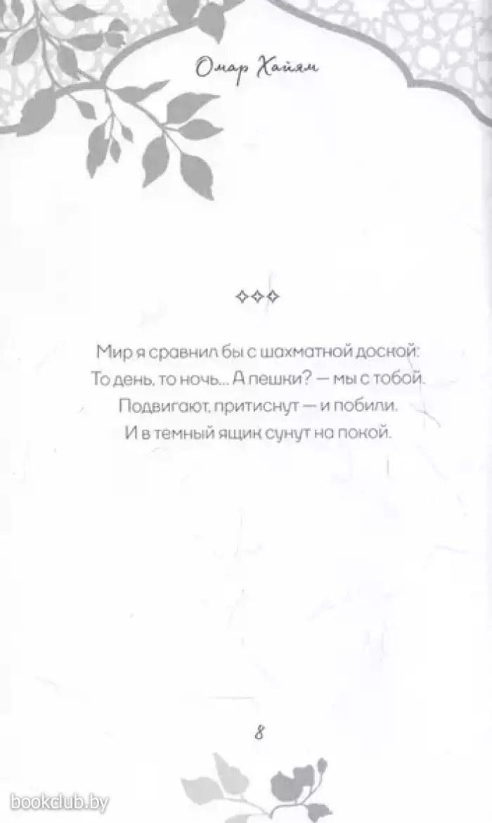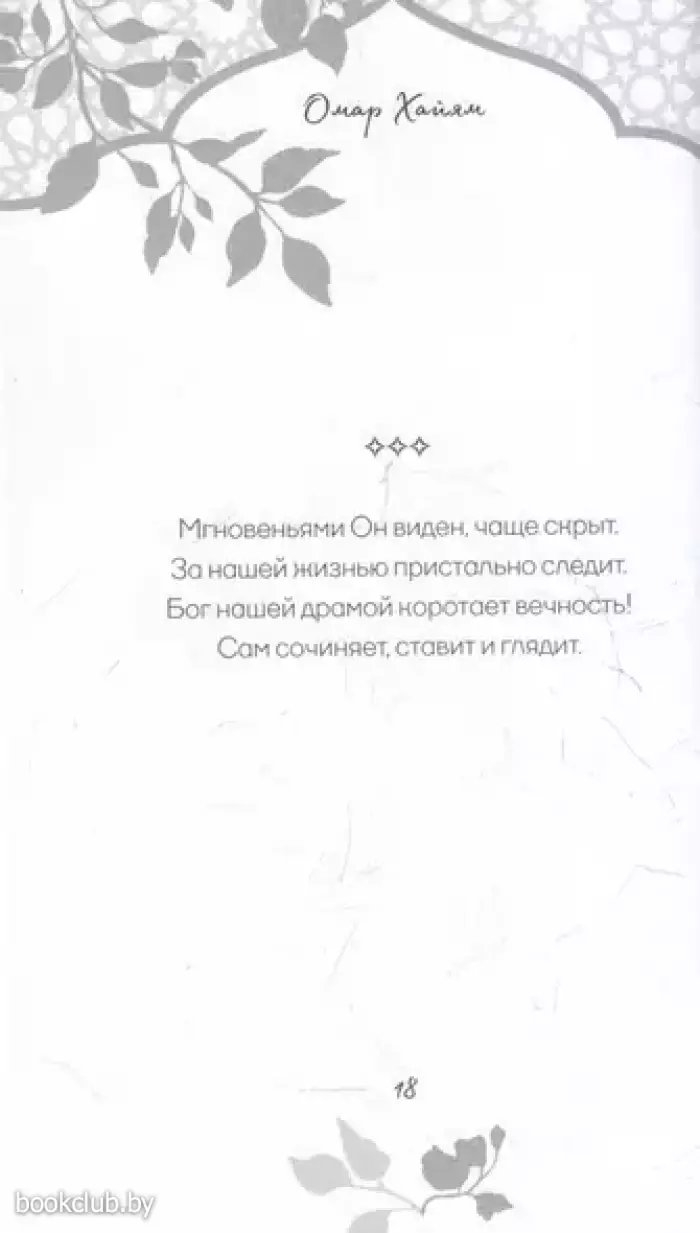 В этой книге собраны стихотворные афоризмы Хайяма в лучших русских переводах. О чем они? О красоте жизни и неизбежности смерти, о любви и о судьбе. Лирический герой выступает то мудрецом, созерцающим вечность, то пройдохой-весельчаком, то отчаявшимся человеком, который вступает в спор с самим Богом. Изящные и емкие четверостишия Хайяма дарят пищу для размышлений, утешают в горе и неизменно восхищают читателей всех времен своей красотой.