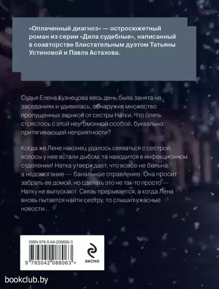 «Оплаченный диагноз» — остросюжетный роман из серии “Дела судебные”, написанный в соавторстве блистательным дуэтом Татьяны Устиновой и Павла Астахова. Судья Елена Кузнецова весь день была занята на заседаниях и удивилась, обнаружив множество пропущенных звонков от сестры Натки. Что опять стряслось с этой неугомонной особой, буквально притягивающей неприятности? Когда же Лене наконец удалось связаться с сестрой, волосы у нее встали дыбом: та находится в инфекционном отделении! Натка утверждает, что вовсе не больна, а недомогание — банальное отравление. Она просит забрать ее домой, но сделать это не так-то просто — Натку не выпускают. Связь прерывается, а когда Лена вновь пытается найти сестру, то слышит ужасные новости…