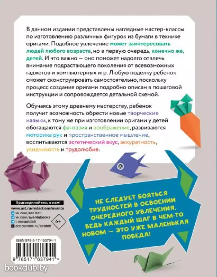 Данное издание ориентировано в первую очередь на детей 8–10 лет, благодаря большому разнообразию представленных моделей оригами на самые разные темы оно заинтересует как мальчиков, так и девочек. И главное — процесс создания каждой бумажной фигурки здесь подробно описан в пошаговой инструкции и сопровождается детальной схемой. Представленные мастер-классы будут понятны всем юным мастерам оригами без исключения.