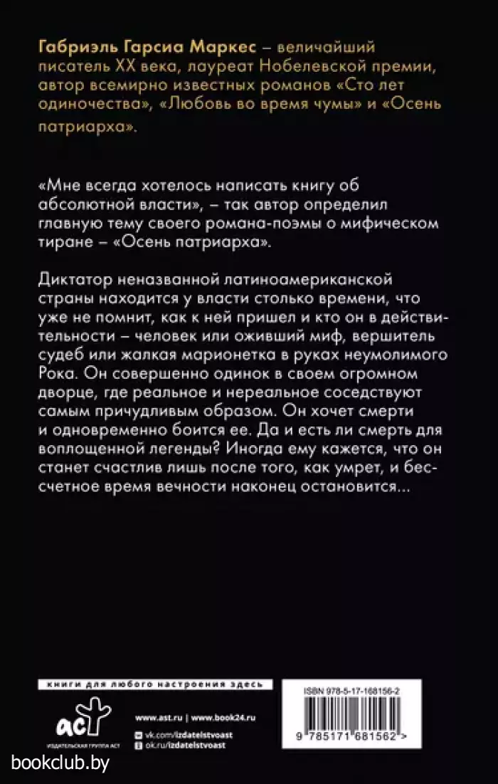Габриэль Гарсиа Маркес – величайший писатель ХХ века, лауреат Нобелевской премии, автор всемирно известных романов "Сто лет одиночества", "Любовь во время чумы" и "Осень патриарха". "Мне всегда хотелось написать книгу об абсолютной власти", – так автор определил главную тему своего романа-поэмы о мифическом тиране – «Осень патриарха». Диктатор неназванной латиноамериканской страны находится у власти столько времени, что уже не помнит, как к ней пришел и кто он в действительности – человек или оживший миф, вершитель судеб или жалкая марионетка в руках неумолимого Рока. Он совершенно одинок в своем огромном дворце, где реальное и нереальное соседствуют самым причудливым образом. Он хочет смерти и одновременно боится ее. Да и есть ли смерть для воплощенной легенды? Иногда ему кажется, что он станет счастлив лишь после того, как умрет, и бессчетное время вечности наконец остановится…