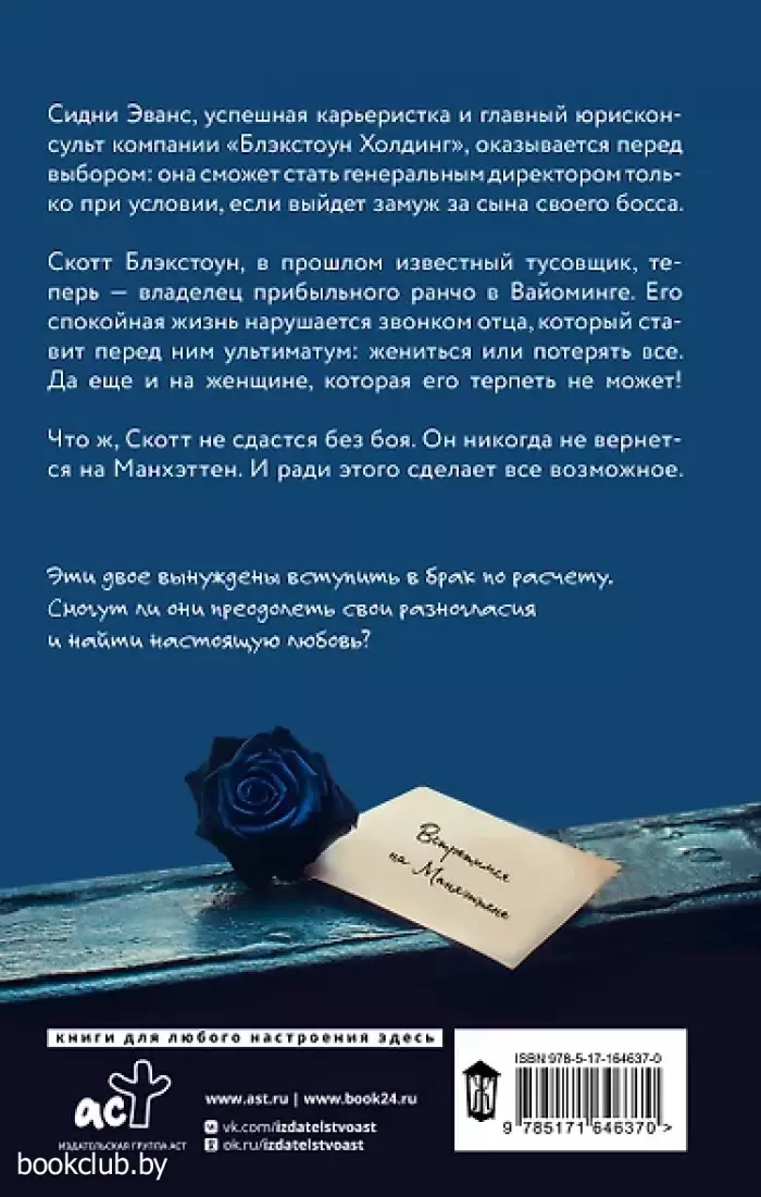 Сидни Эванс, успешная карьеристка и главный юрисконсульт компании «Блэкстоун Холдинг», оказывается перед выбором: она сможет стать генеральным директором только при условии, если выйдет замуж за сына своего босса. Скотт Блэкстоун, в прошлом известный тусовщик, теперь — владелец прибыльного ранчо в Вайоминге. Его спокойная жизнь нарушается звонком отца, который ставит перед ним ультиматум: жениться или потерять всё. Да еще и на женщине, которая его терпеть не может! Что ж, Скотт не сдастся без боя. Он никогда не вернется на Манхэттен. И ради этого сделает все возможное. Эти двое вынуждены вступить в брак по расчету. Смогут ли они преодолеть свои разногласия и найти настоящую любовь?
