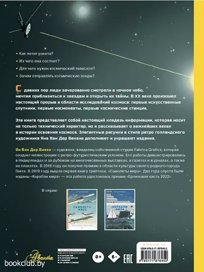 Эта книга представляет собой настоящий кладезь информации, которая носит не только технический характер, но и напоминает контекст завоевания космоса, анекдотические подробности некоторых пилотируемых полетов, закодированные сообщения, отправленные во Вселенную, экологические последствия космических полетов... Элегантные рисунки в стиле ретро голландского художника Яна Ван Дер Векена дополняют и украшают издание.