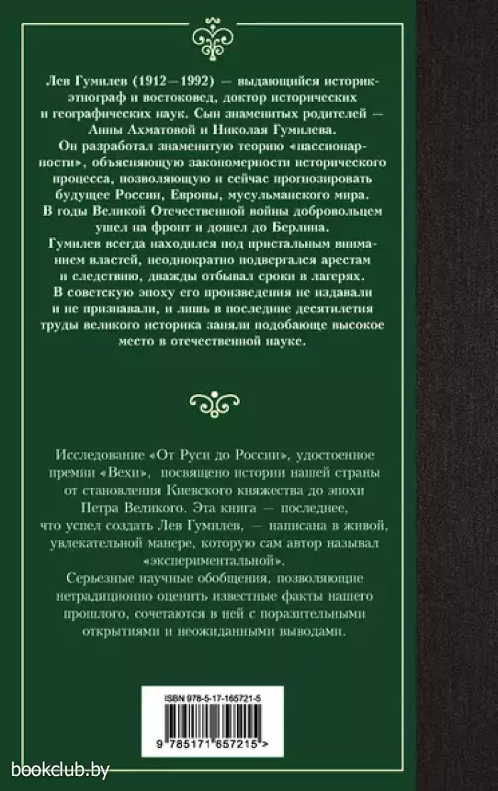 Исследование "От Руси до России", удостоенное премии "Вехи", посвящено истории нашей страны от становления Киевского княжества до эпохи Петра Великого. Эта книга — последнее, что успел создать Лев Гумилев, — написана в живой, увлекательной манере, которую сам автор называл "экспериментальной". Серьезные научные обобщения, позволяющие нетрадиционно оценить известные факты нашего прошлого, сочетаются в ней с поразительными открытиями и неожиданными выводами.
