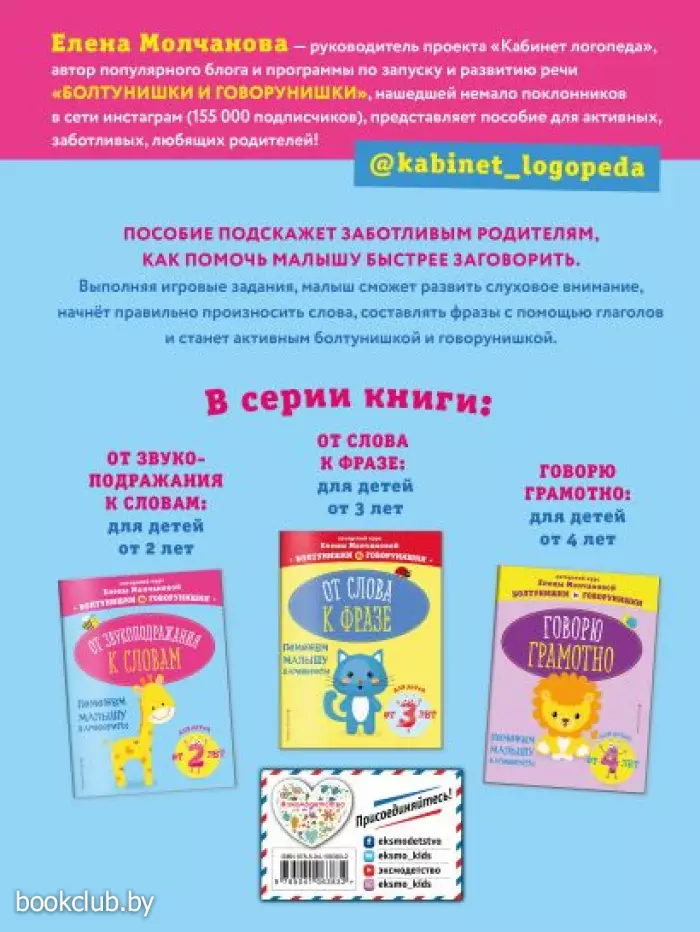 Пособие является авторским курсом Елены Молчановой по запуску и развитию речи малышей, нашедшим немало поклонников в сети «Инстаграм» (155 000 подписчиков).