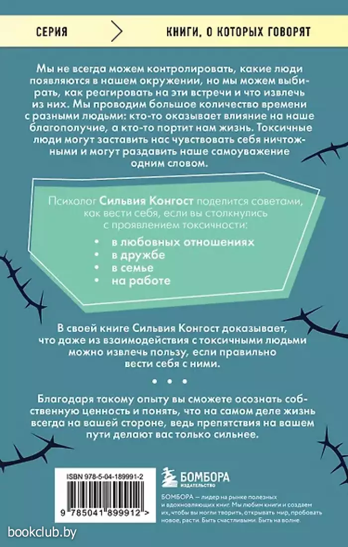 В своей книге Сильвия Конгост доказывает, что даже из взаимодействия с токсичными людьми можно извлечь пользу, если правильно вести себя с ними. Благодаря такому опыту вы сможете осознать собственную ценность и понять, что на самом деле жизнь всегда на вашей стороне, ведь препятствия на вашем пути делают вас только сильнее.