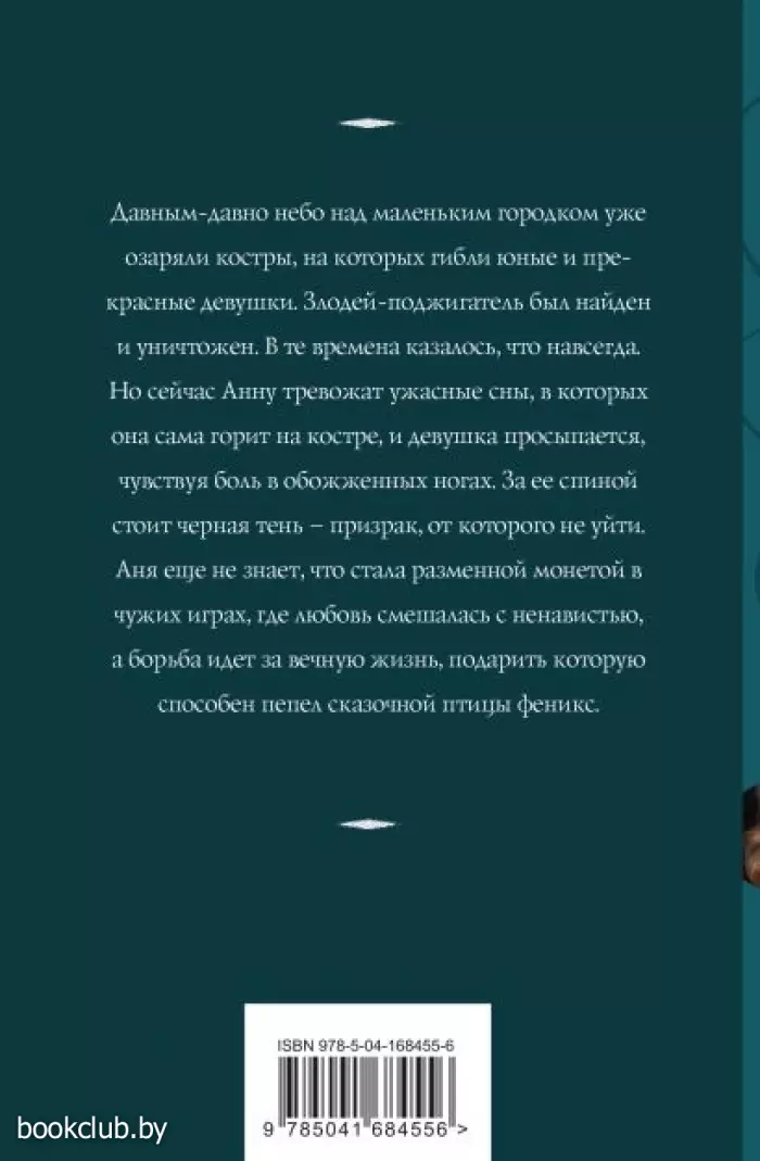 Давным-давно небо над маленьким городком уже озаряли костры, на которых гибли юные и прекрасные девушки. Злодей-поджигатель был найден и уничтожен. В те времена казалось, что навсегда. Но сейчас Анну тревожат ужасные сны, в которых она сама горит на костре, и девушка просыпается, чувствуя боль в обожженных ногах. За ее спиной стоит черная тень — призрак, от которого не уйти. Аня еще не знает, что стала разменной монетой в чужих играх, где любовь смешалась с ненавистью, а борьба идет за вечную жизнь, подарить которую способен пепел сказочной птицы феникса.