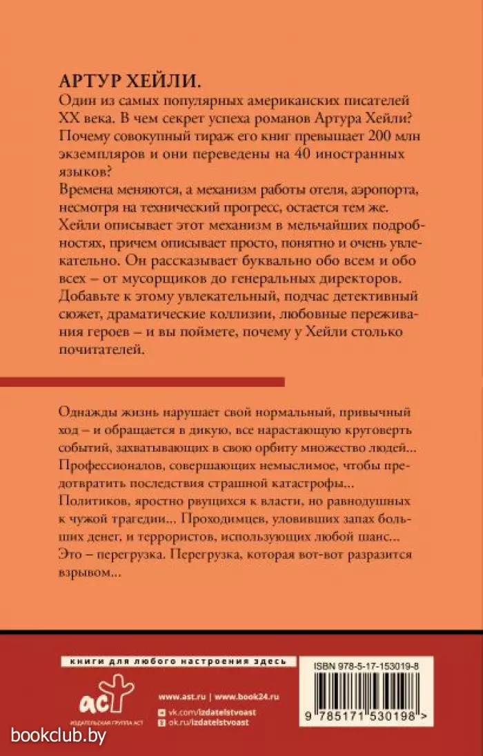 Классический роман в новом переводе. От автора бестселлеров «Аэропорт» и «В высших сферах». Производственный роман о сфере, от которой напрямую зависят судьбы людей. Романы Артура Хейли переведены на 38 языков, а общий тираж превышает 170 млн экземпляров. Однажды жизнь нарушает свой нормальный, привычный ход – и обращается в дикую, все нарастающую круговерть событий, захватывающих в свою орбиту множество людей... Профессионалов, совершающих немыслимое, чтобы предотвратить последствия страшной катастрофы... Политиков, яростно рвущихся к власти, но равнодушных к чужой трагедии... Проходимцев, уловивших запах больших денег, и террористов, использующих любой шанс... Это – перегрузка. Перегрузка, которая вот-вот разразится взрывом...