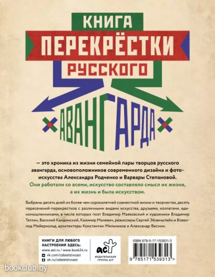 Перекрестки авангарда – это книга-хроника из жизни семейной пары творцов русского авангарда, основоположников современного дизайна и фотоискусства: Александра Родченко и Варвары Степановой. Они работали со всеми, искусство составляло смысл их жизни, а их жизнь и была искусством. Выбраны 10 дней из более чем сорокалетней совместной жизни и творчества, 10 пересечений-перекрестков с различными видами искусства, друзьями, коллегами, единомышленниками, в числе которых поэт Владимир Маяковский и художники Владимир Таллин, Василий Кандинский, Казимир Малевич, режиссеры Сергей Эйзенштейн и Всеволод Мейерхольд, архитекторы Константин Мельников и Александр Веснин. Книги издательства «АСТ» из серии «пАРТер» станут прекрасным дополнением вашей библиотеки. Для вашего удобства при оформлении заказа по телефону назовите код товара: 403548