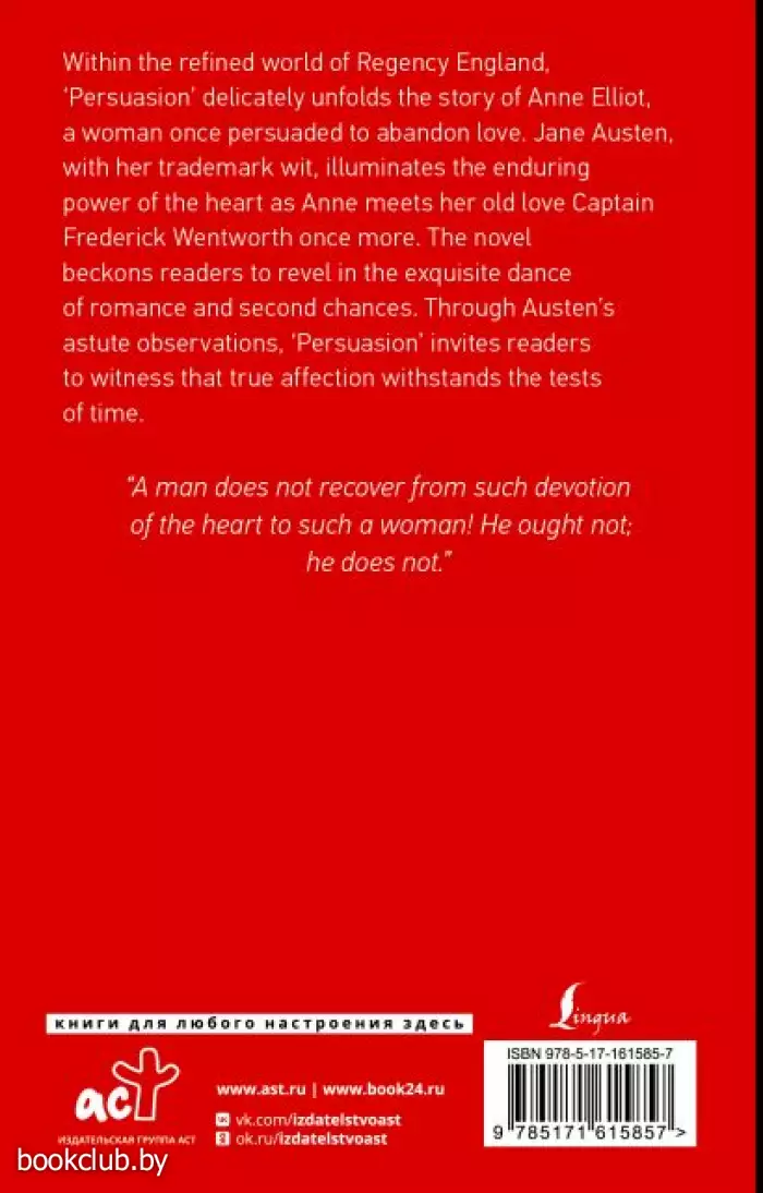 ”Persuasion" или "Доводы рассудка" - это последний роман Остен, писательницы, с чьим именем неразрывно связана английская литература. Он рассказывает о судьбе Энн Элиотт, девушки, которая отказалась от помолвки, уступив доводам "мудрых" людей. Через несколько лет она вновь сталкивается с со своим прежним женихом. Прекрасный шанс для неё; но теплится ли ещё любовь в его сердце?