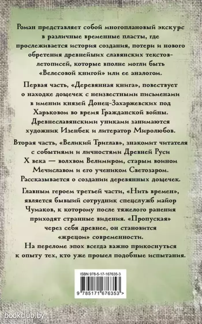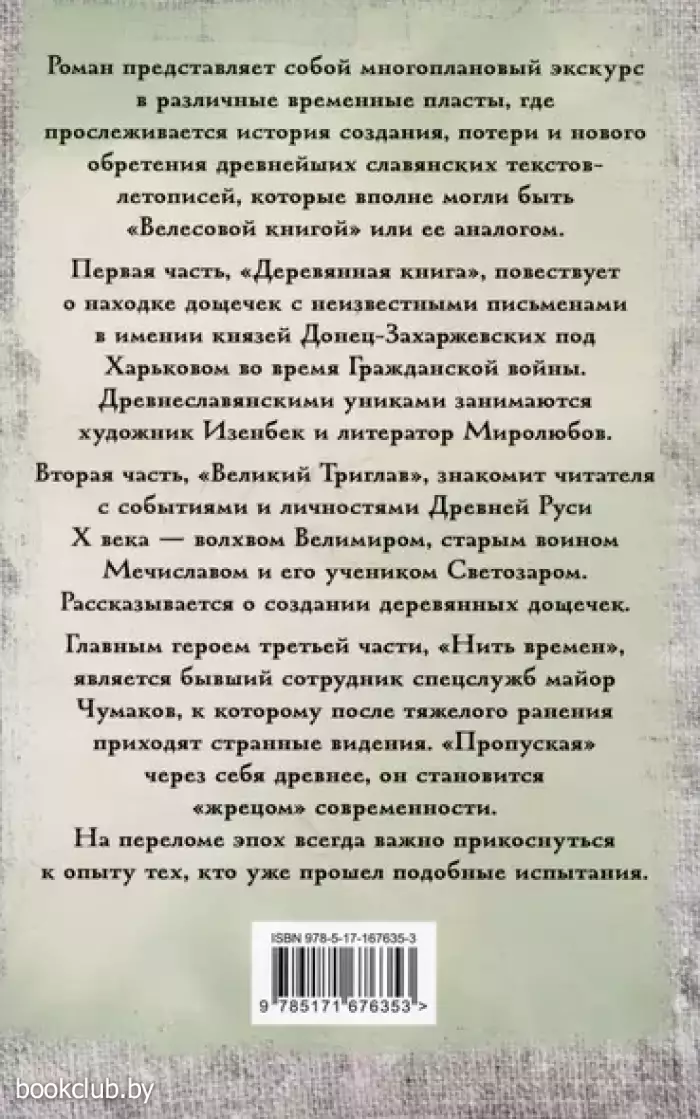 Роман представляет собой многоплановый экскурс в различные временные пласты, где прослеживается история создания,потери и нового обретения древнейших славянских текстов-летописей, которые вполне могли быть «Велесовой книгой» или ее аналогом.