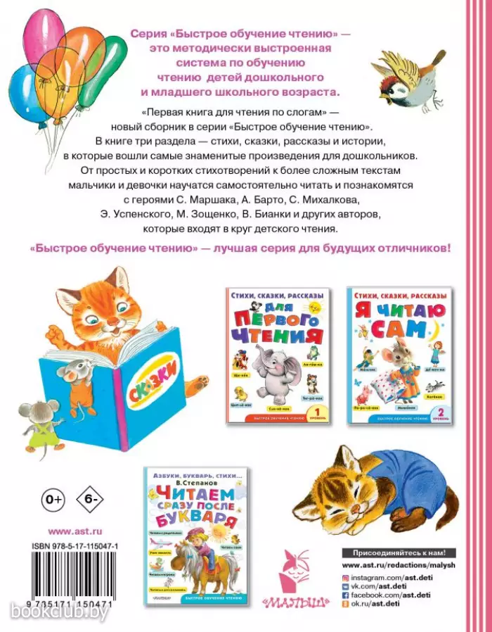 "Первая книга для чтения по слогам" - новый сборник в серии "Быстрое обучение чтению". В книге три раздела - стихи, сказки, рассказы и истории, в которые вошли самые знаменитые произведения для дошкольников. От простых и коротких стихотворений к более сложным текстам мальчики и девочки научатся самостоятельно читать и познакомятся с героями С. Маршака, А. Барто, С. Михалкова, Э. Успенского, Г. Остера, М. Зощенко, В. Бианки и других авторов, которые входят в круг детского чтения. Большой тренажер для обучения чтению проведет малышей от простых и коротких стихотворений к более сложным текстам. Книга не только поможет эффективно освоить навык чтения, но и познакомит с классикой детской литературы. В сборник вошли тексты нескольких десятков авторов: С. Маршака, Э. Успенского, А. Барто, С. Михалкова, Г. Остера, В. Бианки и многих других. Для дошкольного возраста. Книги издательства «АСТ» из серии «Быстрое обучение чтению» станут прекрасным дополнением вашей библиотеки. Для вашего удобства при оформлении заказа по телефону назовите код товара: 140351