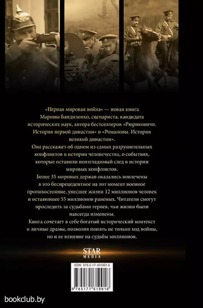 «Первая мировая война» — новая книга Марины Бандиленко, сценариста, кандидата исторических наук, автора бестселлеров «Рюриковичи. История первой династии» и «Романовы. История великой династии». Она расскажет об одном из самых разрушительных конфликтов в истории человечества, о событиях, которые оставили неизгладимый след в истории мировых конфликтов. Более 35 мировых держав оказались вовлечены в это беспрецедентное на тот момент военное противостояние, унесшее жизни 12 миллионов человек и оставившее 55 миллионов раненых. Читатели смогут проследить за судьбами героев, чьи жизни были навсегда изменены. Книга сочетает в себе богатый исторический контекст и личные драмы, позволяя понять не только ход войны, но и её влияние на судьбы миллионов.
