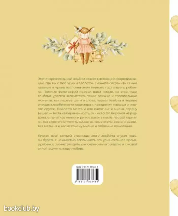 Этот очаровательный альбом станет настоящей сокровищницей, где вы с любовью и теплотой сможете сохранить самые главные и яркие воспоминания первого года вашего ребенка. Помимо фотографий первых дней жизни, на страницах альбома удастся запечатлеть такие важные и трогательные моменты, как первые шаги и слова, первая улыбка и первые игрушки, особенности характера и поведения малыша и многое другое. Найдется место и для памятных и милых сердцу вещей — теста на беременность, снимка УЗИ, бирочки из роддома, отпечатков ножки и ручки, локона после первой стрижки. Вы сможете отметить самые важные этапы роста и развития малыша и написать ему милые и забавные пожелания. Листая всей семьей страницы этого альбома спустя годы, вы будете с нежностью вспоминать это удивительное время, а ребенок сможет увидеть, как сильно вы его ждали, и с новой силой ощутить вашу любовь.