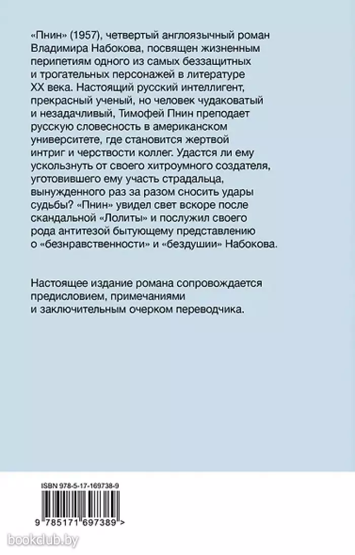 «Пнин» (1957), четвертый англоязычный роман Владимира Набокова, посвящен жизненным перипетиям одного из самых беззащитных и трогательных персонажей в литературе XX века. Настоящий русский интеллигент, прекрасный ученый, но человек чудаковатый и незадачливый, Тимофей Пнин, покинувший Россию после революции 1917 года, преподает русскую словесность в американском университете, где становится случайной жертвой интриг и черствости коллег. Удастся ли ему на этот раз ускользнуть от своего хитроумного создателя, уготовившего ему участь страдальца, вынужденного раз за разом сносить удары судьбы? «Пнин» увидел свет вскоре после скандальной «Лолиты» и, получив восторженные отзывы читателей и критиков, послужил своего рода антитезой бытующему представлению о «безнравственности» и «бездушии» Набокова. Настоящее издание романа сопровождается предисловием, примечаниями и заключительным очерком переводчика. Сохранены особенности орфографии, пунктуации и транслитерации переводчика.
