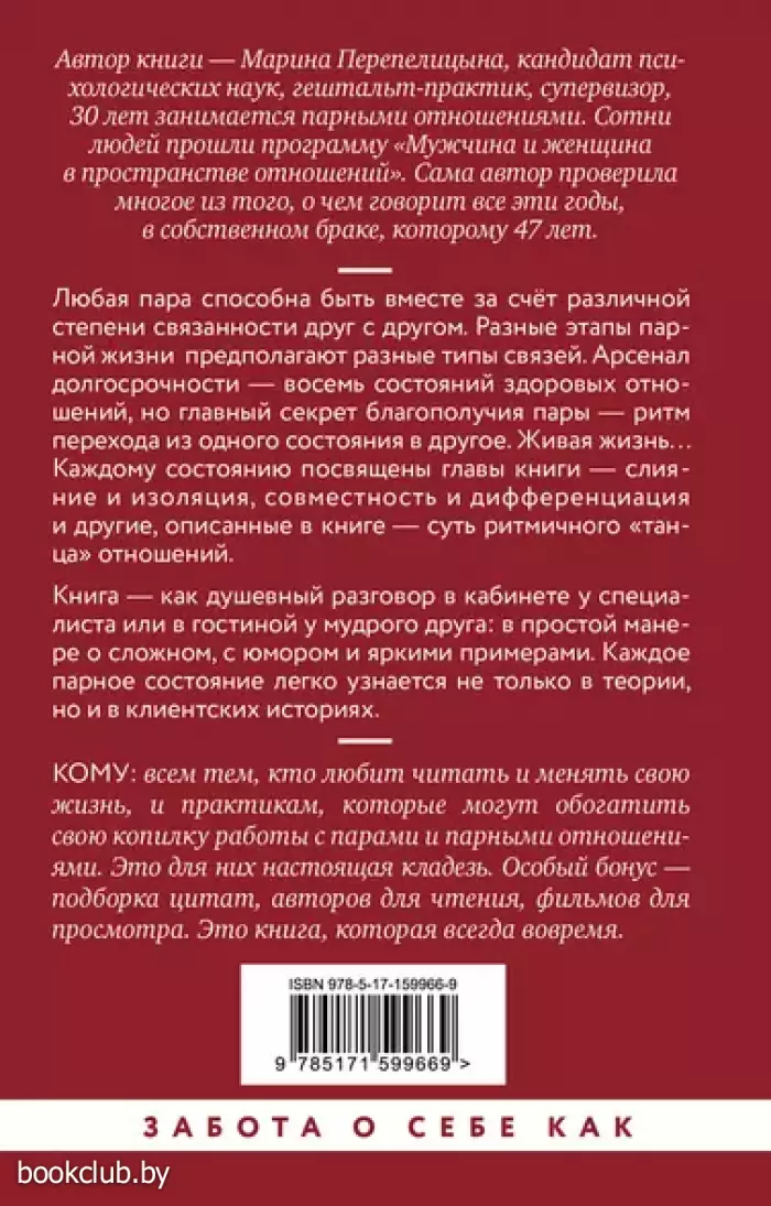Любая пара может быть вместе за счет различной степени связанности друг с другом. Разные этапы парной жизни предполагают разные типы связей. Арсенал долгосрочности — восемь состояний здоровых отношений, но главный секрет благополучия пары – ритм перехода из одного состояния в другое. Живая жизнь… Каждому состоянию посвящены главы книги — слияние и изоляция, совместность и дифференциация и другие, описанные в книге — суть ритмичного «танца» отношений.