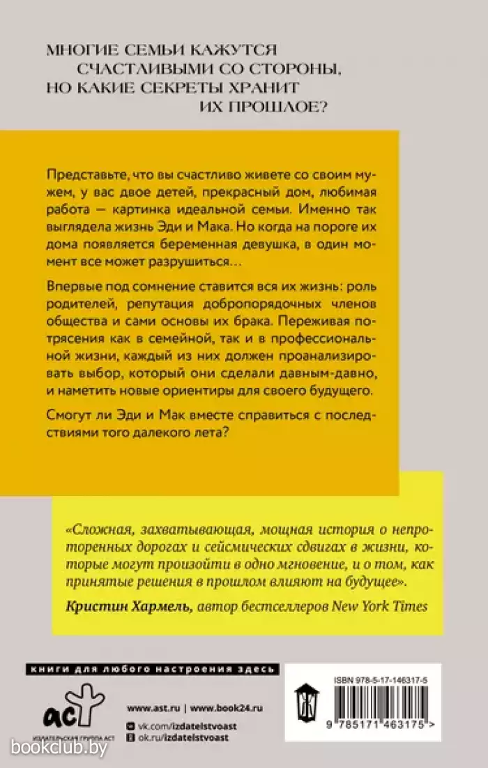 Многие семьи кажутся счастливыми со стороны, но какие секреты хранит их прошлое? Представьте, что вы счастливо живете со своим мужем, у вас двое детей, прекрасный дом, любимая работа — картинка идеальной семьи. Именно так выглядела жизнь Эди и Мака. Но когда на пороге их дома появляется беременная девушка, в один момент все может разрушиться… Впервые под сомнение ставится вся их жизнь: роль родителей, репутация добропорядочных членов общества и сами основы их брака. Переживая потрясения как в семейной, так и в профессиональной жизни, каждый из них должен проанализировать выбор, который они сделали давным-давно, и наметить новые ориентиры для своего будущего. Смогут ли Эди и Мак вместе справиться с последствиями того далекого лета? «Сложная, захватывающая, мощная история о непроторенных дорогах и сейсмических сдвигах в жизни, которые могут произойти в одно мгновение, и о том, как принятые решения в прошлом влияют на будущее». Кристин Хармель, автор бестселлеров New York Times