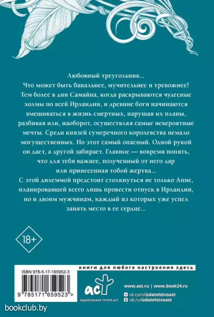 Любовный треугольник... Что может быть банальнее, мучительнее и тревожнее? Тем более в дни Самайна, когда раскрываются чудесные холмы по всей Ирландии, и древние боги начинаются вмешиваться в жизнь смертных, нарушая их планы, разбивая или, наоборот, осуществляя самые невероятные мечты. Среди князей сумеречного королевства немало могущественных. Но этот самый опасный. Одной рукой он дает, а другой забирает. Главное — вовремя понять, что для тебя важнее, полученный от него дар или принесенная тобой жертва... С этой дилеммой предстоит столкнуться не только Анне, планировавшей всего лишь провести отпуск в Ирландии, но и двоим мужчинам, каждый из которых уже успел занять место в ее сердце...