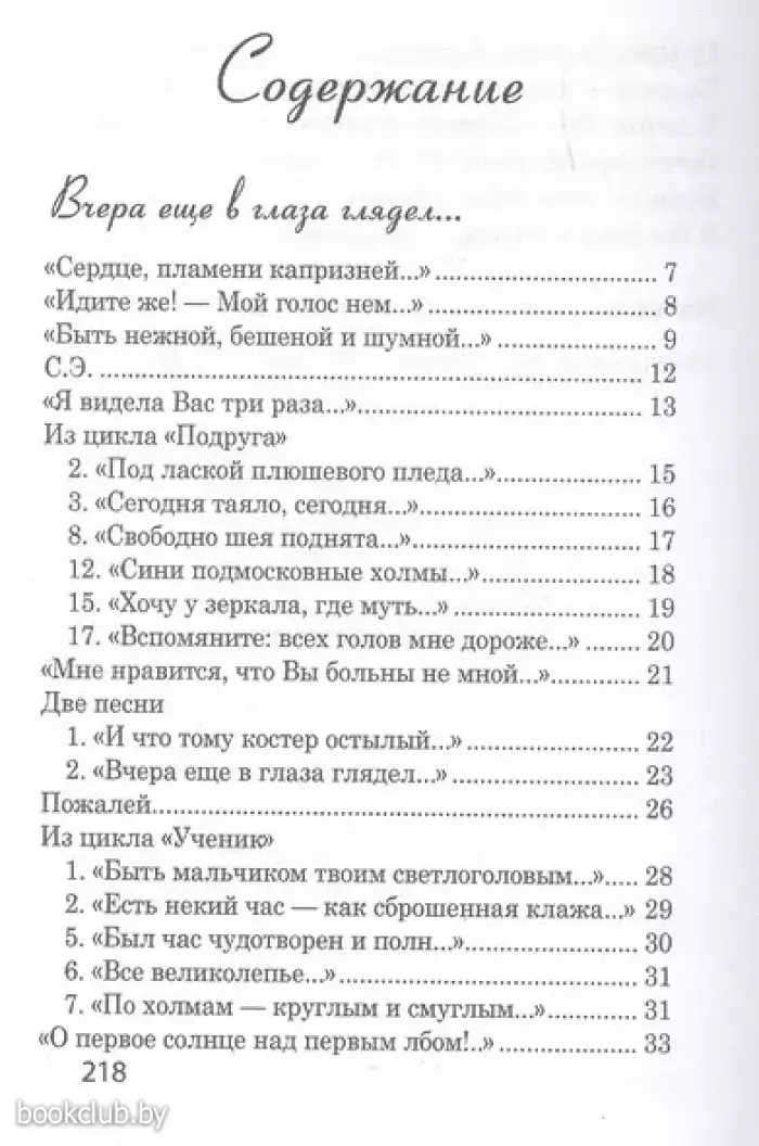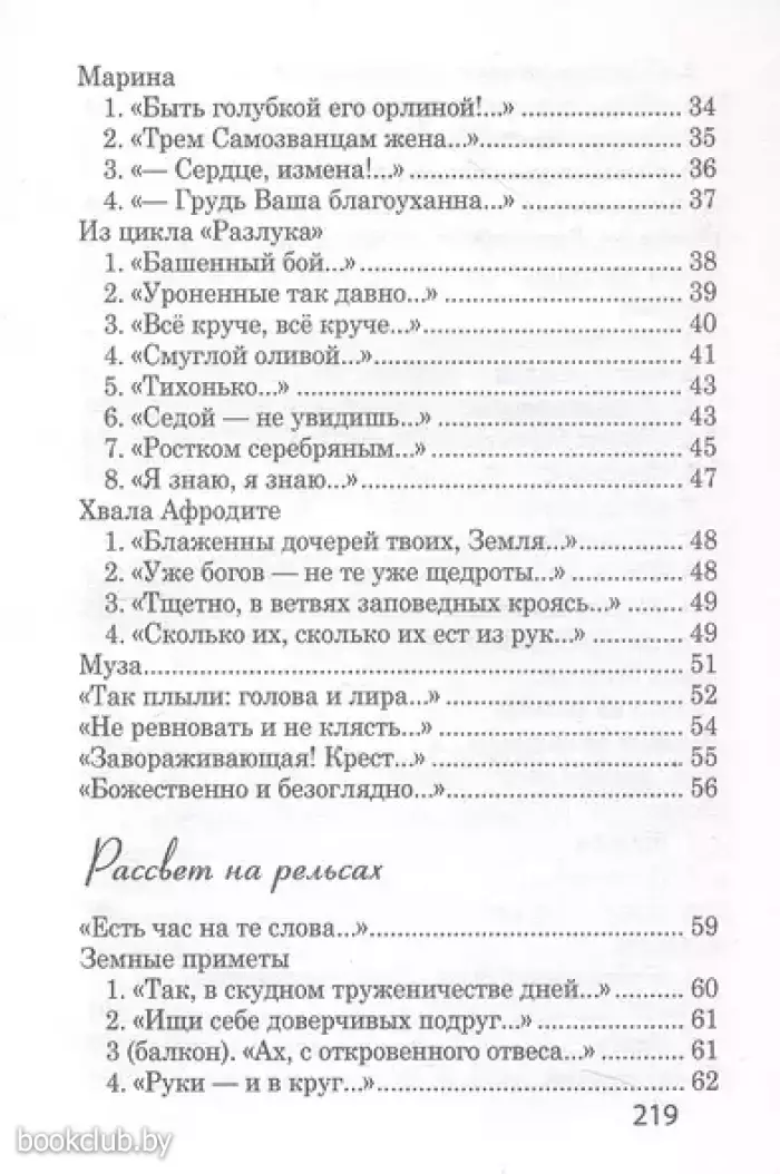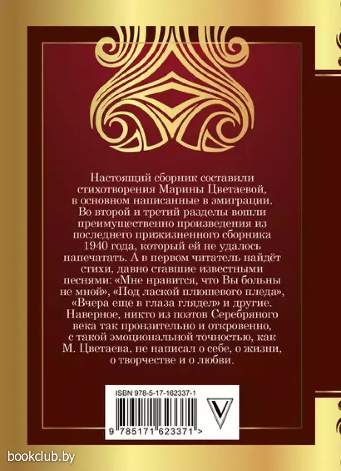 Настоящий сборник составили стихотворения Марины Цветаевой, в основном написанные в эмиграции. Во второй и третий разделы вошли преимущественно произведения из последнего прижизненного сборника 1940 года, который ей не удалось напечатать. А в первом читатель найдёт стихи, давно ставшие известными песнями: "Мне нравится, что Вы больны не мной", "Под лаской плюшевого пледа", "Вчера еще в глаза глядел" и другие. Наверное, никто из поэтов Серебряного века так пронзительно и откровенно, с такой эмоциональной точностью, как М. Цветаева, не написал о себе, о жизни, о творчестве и о любви. Ее поэтические строки восхищают виртуозностью создания, слог завораживает, образы потрясают воплощением.