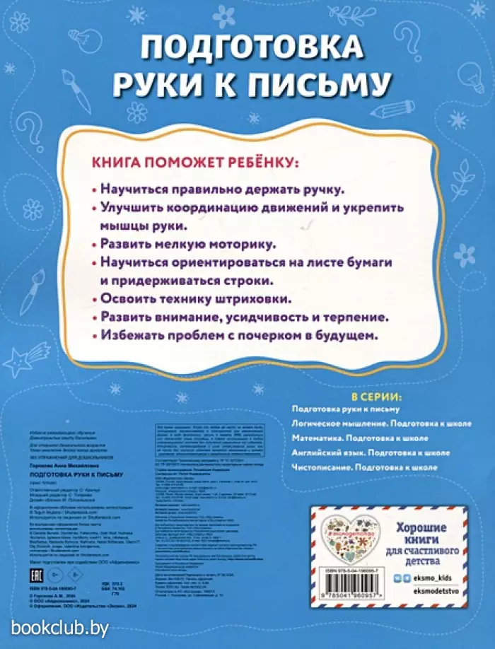 Эта книга для детей от 3 лет поможет дошкольнику развить мелкую моторику рук и подготовить руку к письму. В дальнейшем это поможет ему избежать проблем с чистописанием и стать обладателем красивого почерка. В рабочей тетради более 365 упражнений для подготовки руки к письму, рассчитанных на каждый день года. Это способствует равномерному распределению учебно-игровой нагрузки и формированию положительного отношения ребёнка к обучению. Дошкольник потренируется обводить линии, рисунки, элементы букв, штриховать, дорисовывать детали изображений и рисовать картинки по образцу. Он научится ориентироваться на листе бумаги, рисовать, придерживаясь строки, станет внимательным, аккуратным, самостоятельным и приобретёт другие важные навыки, необходимые при обучении в школе.