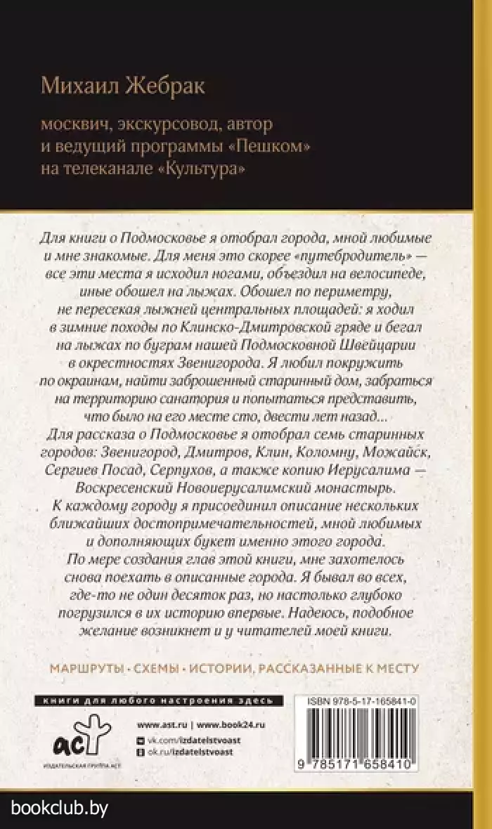 Михаил Жебрак — москвич, экскурсовод, автор и ведущий программы "Пешком" на телеканале "Культура". Предлагаем вам вместе с автором этого путеводителя прогуляться по Подмосковью.