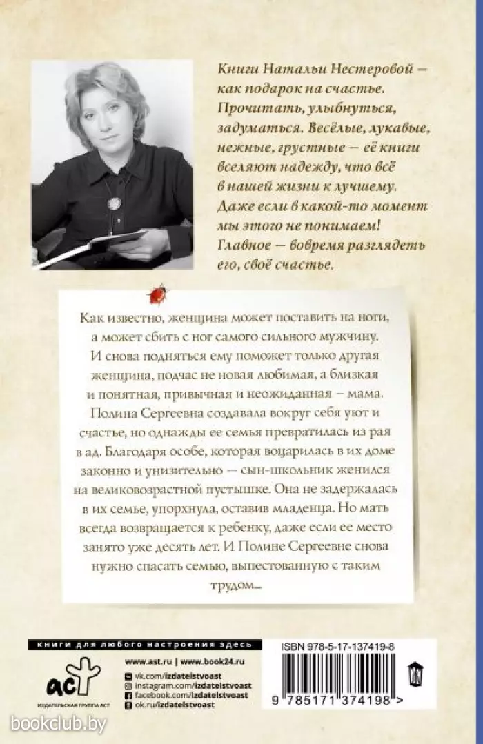 Как известно, женщина может поставить на ноги, а может сбить с ног самого сильного мужчину. И снова подняться ему поможет только другая женщина, подчас не новая любимая, а близкая и понятная, привычная и неожиданная – мама. Полина Сергеевна создавала вокруг себя уют и счастье, но однажды ее семья превратилась из рая в ад. Благодаря особе, которая воцарилась в их доме законно и унизительно — сын-школьник женился на великовозрастной пустышке. Она не задержалась в их семье, упорхнула, оставив младенца. Но мать всегда возвращается к ребенку, даже если ее место занято уже десять лет. И Полине Сергеевне снова нужно спасать семью, выпестованную с таким трудом...