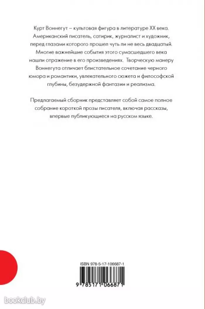Курт Воннегут – культовая фигура в литературе ХХ века. Американский писатель, сатирик, журналист и художник, перед глазами которого "прошел" чуть ли не весь двадцатый. Многие важнейшие события этого сумасшедшего века нашли отражение в его произведениях. Творческую манеру Воннегута отличают блистательное сочетание черного юмора и романтики, увлекательного сюжета и философской глубины, безудержной фантазии и реализма.