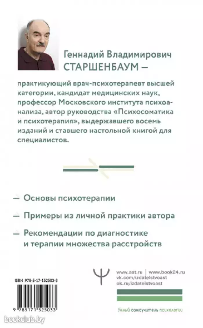 Геннадий Старшенбаум — автор с многолетней психотерапевтической практикой, — помог наладить жизнь тысячам человек. Эта книга станет настольной для студентов и выпускников, теоретиков и практиков, а также преподавателей в области психотерапии, потому что материал в ней структурирован максимально четко и ясно. Книга незаменима в процессе освоения основ психотерапии, минимизирует время на прочтение многотомников по интересующим вопросам и будет полезна не только будущим специалистам, но и просто любознательным читателям, так как знакомит с миром психотерапии очень подробно! В книге приводятся самые интересные примеры из личной практики автора.