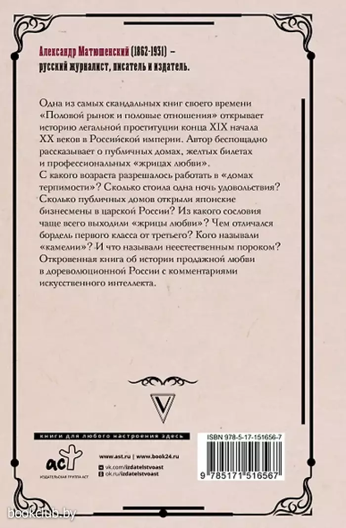 Одна из самых скандальных книг своего времени «Половой рынок и половые отношения» открывает историю легальной проституции конца XIX начала XX веков в Российской империи. Автор беспощадно рассказывает о публичных домах, желтых билетах и профессиональных «жрицах любви».