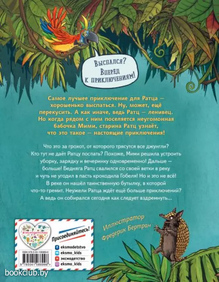 Ратц и Мими — ленивец и бабочка, которая живёт в его шерсти. И хотя вся эта история — забавный вымысел, этот факт взят из настоящей дикой природы — в шерсти ленивцев и правда живут бабочки! Старина Ратц из этой истории очень любит поспать, а вот Мими — сущая егоза, она обожает убираться и веселиться. И из них получается отличная команда, особенно когда Ратц находит в реке волшебную штуковину, которая может… А что именно она может — узнайте, прочитав историю «Послание в бутылке»! В ней вас ждут уморительные приключения животных в джунглях, которые сопровождаются забавными цветными иллюстрациями. А иллюстрации эти нарисовал тот же художник, что и оформлял книги-бестселлеры «Не открывать! Кусается!» и др.