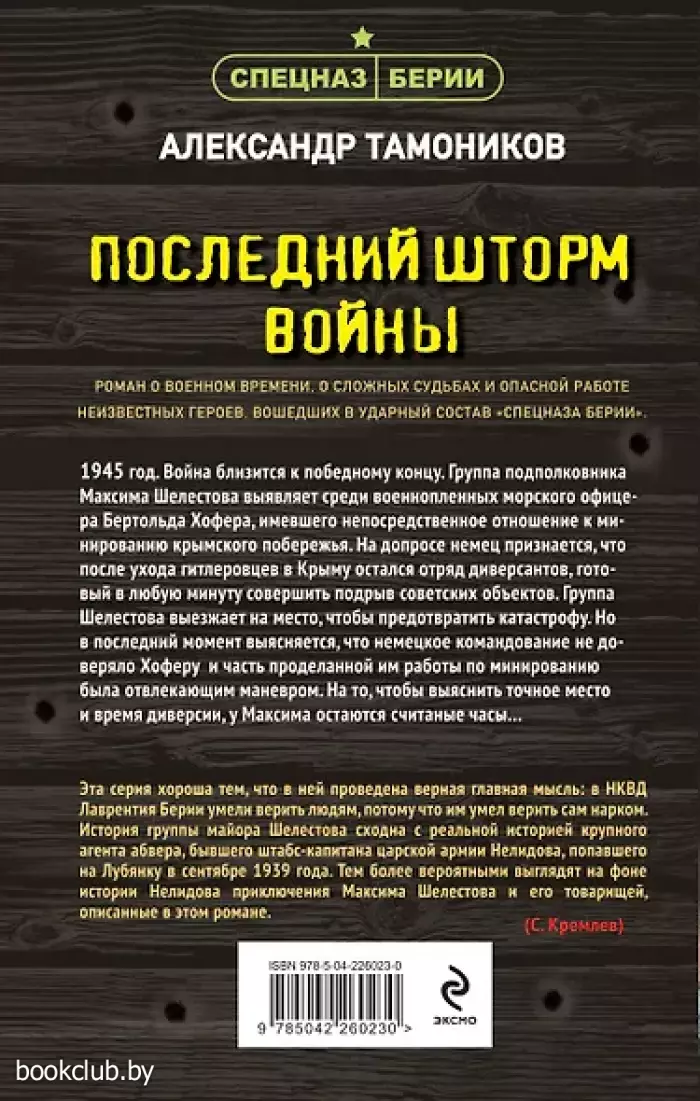 Книга «Последний шторм войны», входящая в серию «Спецназ Берии. Герои секретной войны», сможет доставить вам немало удовольствия от прочтения и надолго запомниться. Для вашего удобства при оформлении заказа по телефону назовите код товара: 416292