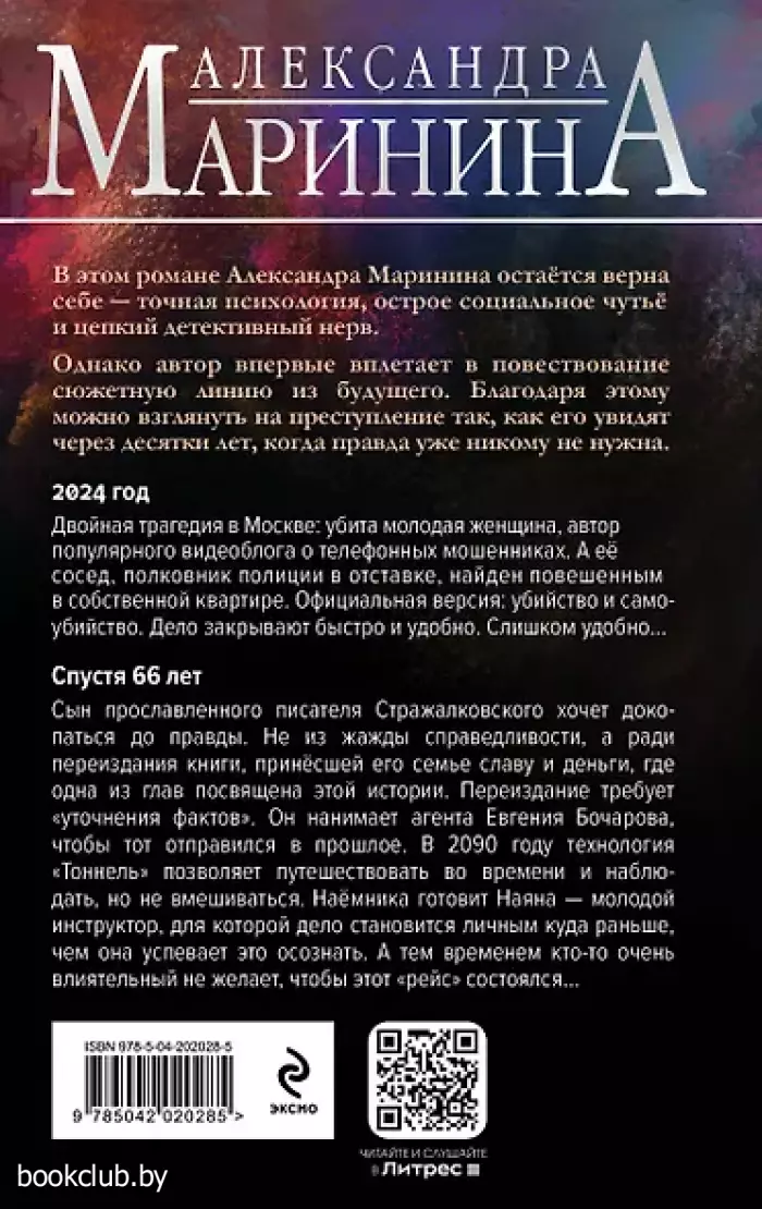 В этом романе Александра Маринина остаётся верна себе — точная психология, острое социальное чутьё и цепкий детективный нерв. Однако автор впервые вплетает в повествование сюжетную линию из будущего. Благодаря этому можно взглянуть на преступление так, как его увидят через десятки лет, когда правда уже никому не нужна.