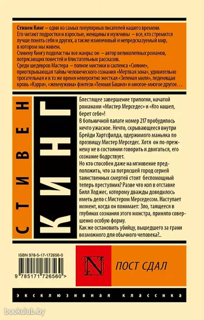 В больничной палате номер 217 пробудилось нечто ужасное. Нечто, скрывающееся внутри Брейди Хартсфилда, одержимого маньяка по прозвищу Мистер Мерседес. Хотя он по-прежнему не в состоянии говорить и двигаться, его сознание бодрствует. Но кто способен даже на мгновение предположить, что за потрясшей город серией таинственных смертей стоит беспомощный теперь преступник? Разве что коп в отставке Билл Ходжес, которому дважды доводилось иметь дело с Мистером Мерседесом. Наступает момент, когда он понимает: Зло, таящееся в глубинах сознания этого монстра, приняло совершенно особую форму. Как же остановить убийцу, вышедшего за грани возможного для обычного человека?..
