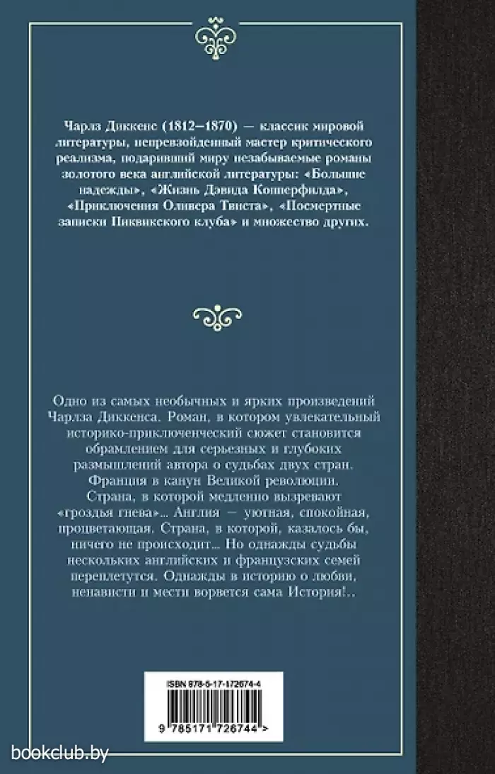 Одно из самых необычных и ярких произведений Чарлза Диккенса. Роман, в котором увлекательный историко-приключенческий сюжет становится обрамлением для серьезных и глубоких размышлений автора о судьбах двух стран. Франция в канун Великой революции. Страна, в которой медленно вызревают "гроздья гнева"… Англия – уютная, спокойная, процветающая. Страна, в которой, казалось бы, ничего не происходит… Но однажды судьбы нескольких английских и французских семей переплетутся. Однажды в историю о любви, ненависти и мести ворвется сама История!..