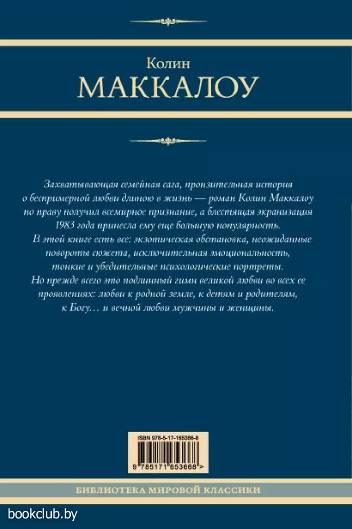 Захватывающая семейная сага, пронзительная история о беспримерной любви длиною в жизнь – роман Колин Маккалоу по праву получил всемирное признание, а блестящая экранизация 1983 года принесла ему еще большую популярность.