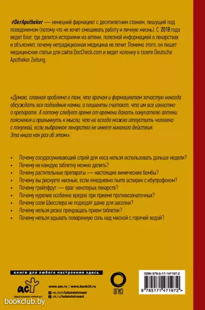 #DerApotheker — анонимный немецкий фармацевт с десятилетним стажем. Изо дня в день ему приходится повторять посетителям аптеки одни и те же рекомендации и предостережения о препаратах с недоказанной эффективностью. С 2018 года ведет блог, где не только делится полезной информацией о лекарствах, но и рассказывает о гомеопатии и псевдомедицине, опираясь на доказательную медицину.Многие люди часто не знают самых важных фактов о таблетках, спреях и каплях, которые принимают на регулярной основе. Из-за незнания они подвергают себя опасности. В этой книге объясняется, как работают бестселлеры из аптеки, что нужно учитывать при их приеме и в каких случаях вы выбрасываете деньги на ветер.• Почему сосудосуживающий спрей для носа нельзя использовать дольше недели?• Почему не каждую таблетку можно делить?• Почему растительные препараты — настоящие химические бомбы?• Почему вы рискуете жизнью, если ежедневно пьете аспирин с ибупрофеном?• Почему грейпфрут — враг некоторых лекарств?• Почему курение особенно вредно при приеме противозачаточных?• Почему соли Шюсслера не подходят даже для засолки?• Почему нельзя резко прекращать прием таблеток?• Почему нельзя вдыхать поваренную соль над миской с горячей водой?