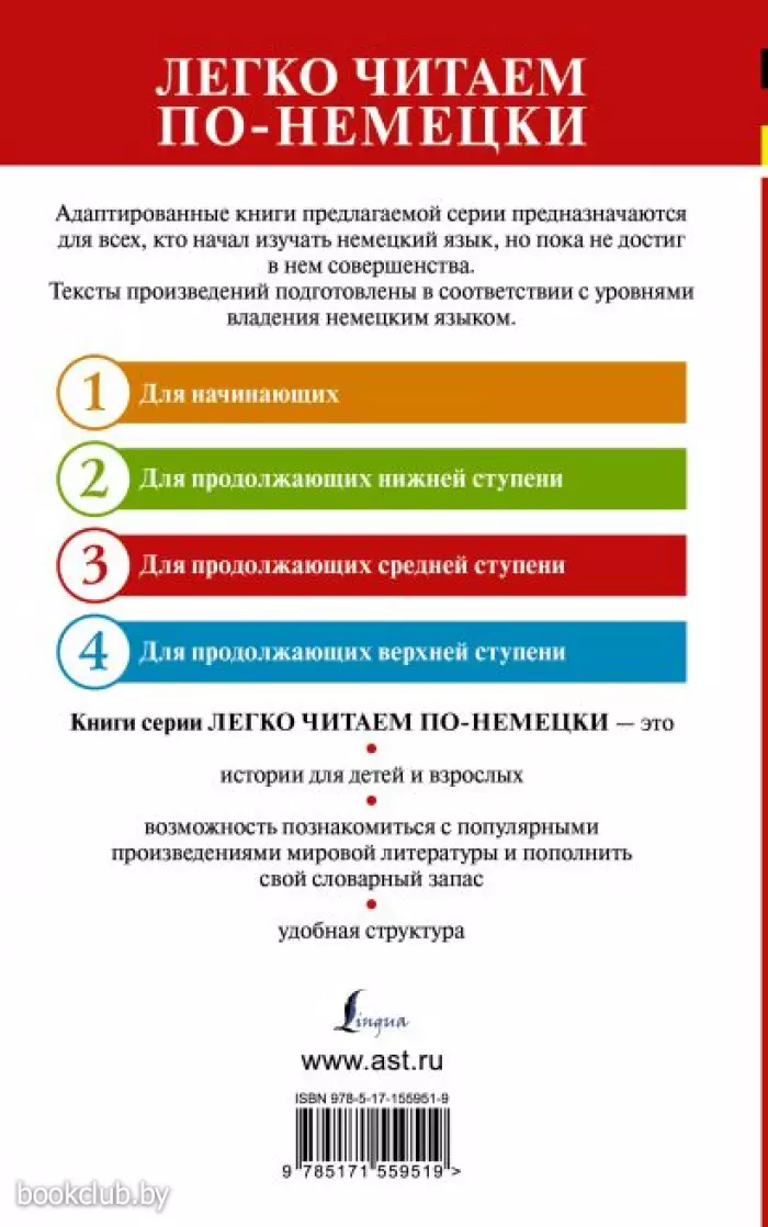 Тексты произведений адаптированы для продолжающих изучать немецкий язык средней ступени (уровни B1-B2 – Oberstufe) и снабжены комментариями. После рассказов предлагаются упражнения с ключами. В конце книги – словарь используемой лексики, облегчающий чтение. Книги издательства «АСТ» из серии «Легко читаем по-немецки» станут прекрасным дополнением вашей библиотеки. Для вашего удобства при оформлении заказа по телефону назовите код товара: 403737