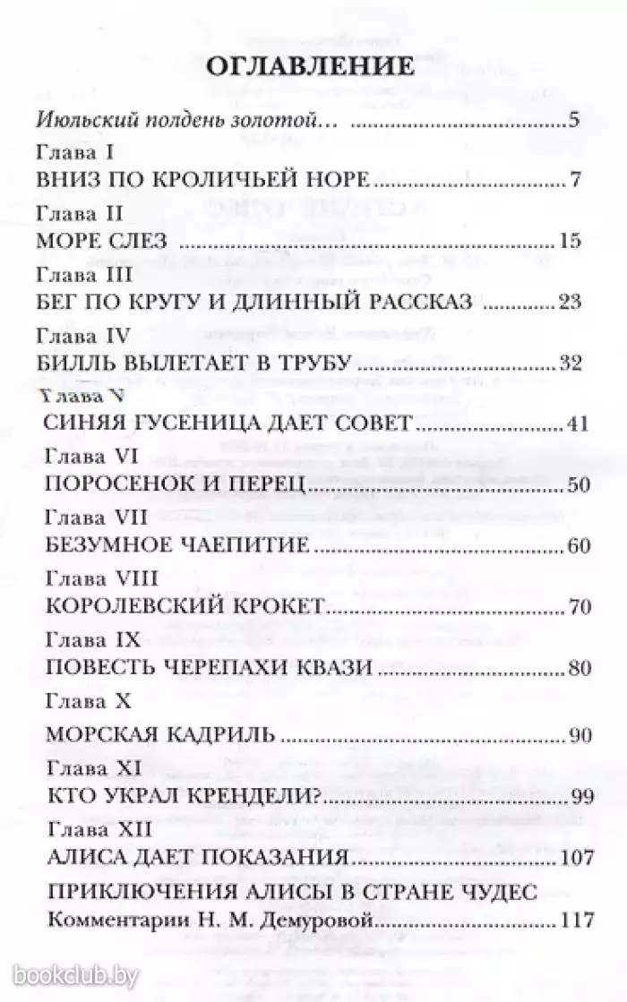 Однажды маленькой Алисе наскучило сидеть на берегу реки, и она решила проследить за белым кроликом, который бежал мимо. Могла ли девочка подумать, что, последовав за зверьком и провалившись в кроличью нору, можно оказаться… в Стране Чудес?! Там ничего не подчиняется законам логики и здравого смысла, там живут очень странные и недружелюбные существа, а их диалоги больше похожи на ребусы и загадки. Алисе очень трудно понять, что происходит в этой сказочной стране, но любопытство берет верх… Сказка в классическом переводе Н. М. Демуровой. В конце книги есть комментарии Н. М. Демуровой.