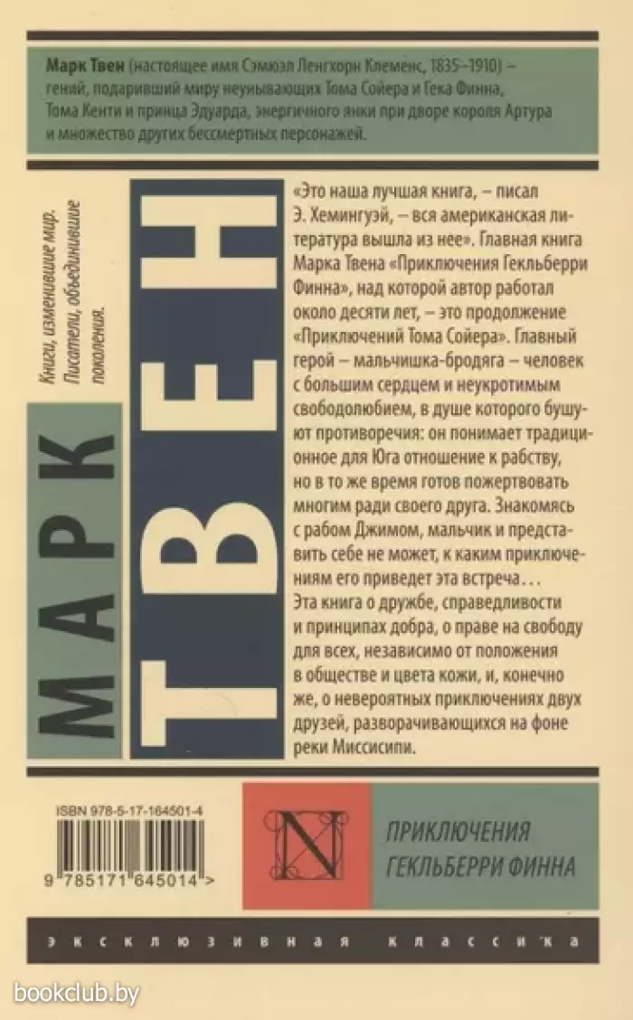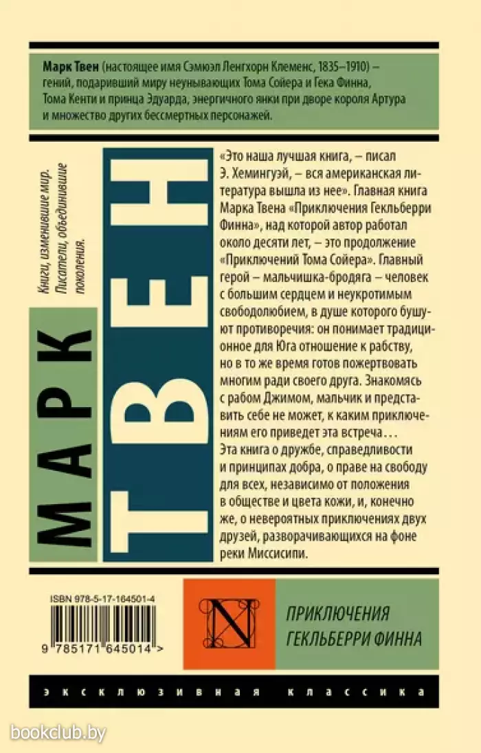 «Приключения Гекльберри Финна» — книга, продолжающая историю «Приключений Тома Сойера», над которой Марк Твен работал более десяти лет, произвела на общество гораздо большее влияние, чем её предшественница. На сегодняшний день «Гек Финн» входит в число Великих американских романов, а Эрнест Хемингуэй в свое время сказал, что именно из этой книги выросла вся американская литература.